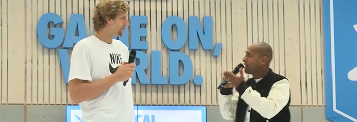 Basketballlegende Dirk Nowitzki kam zum Abschluss seiner Karriere nach Berlin und brachte NBA Star Dennis Schroeder mit. AMIAZ moderierte das BBall Game und unterhielt auch die u.a. 500 Kids, die von Nike eingeladen wurden um mit den Stars einen ganz Tag Basketball zu spielen.